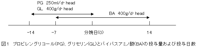 ・7頭 グリセリン+バイパスアミノ酸区(GL+BA区) PGの投与は250ml/d/head、GL投与は400g/d/headとし、両者とも投与期間は分娩14日前~分娩日(14日間)とする。BAの投与は400g/d/head、分娩7日前~分娩14日後(21日間)とする。GLは25%グリセリン含有ペレット製剤を使用し、BAはバイパスメチオニンを添加した大豆バイパスタンパク質製剤を使用する。(図1) |