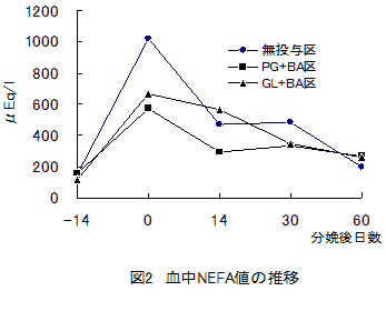 無投与区では4頭中3頭がケトーシスを発症したが(発症率75%)、PG+BA区およびGL+BA区ではケトーシスは発症せず(発症率0%)、ケトーシス予防に効果がある。 |