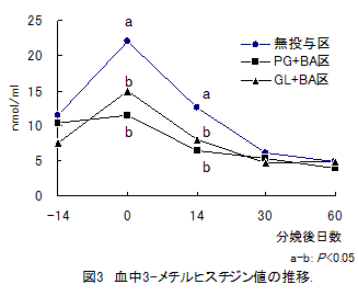 分娩日におけるPG+BA区、GL+BA 区の血中遊離脂肪酸(NEFA)は無投与区より低い傾向を示し、同様に分娩日と分娩14日後におけるPG+BA区、GL+BA 区の血中3-メチルヒスチジンは無投与区より低く(P<0.05)、PG+BAおよびGL+BA投与は体脂肪および体タンパク質動員を抑制する。(図2、3) |