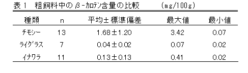 肥育農家の購入粗飼料中のβ-カロテン含量を調査した結果、チモシー乾草はロットによるバラつきが大きく、平均1.68mg/100gであり、ライグラス(ペレニアル、イタリアンなど)やイナワラ(自家産を含む)は、ばらつきが少なく0.04~0.13mg/100g含有している(表1)。 |