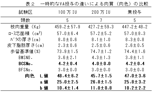 一時的なVA補給と肉質の影響を調査するために、肥育後期の出荷30日前の黒毛和種に経口VA製剤100万IU、200万IU投与し、無投与区の枝肉の肉色等を比較したが差は認められない(表2)。 |