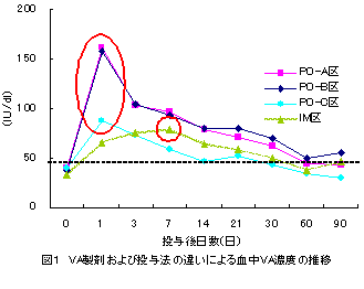血中VA濃度50IU/dl以下の黒毛和種肥育牛40頭を用いて、VA経口投与剤3種類(PO-A:VAD3E+B群とアルコール等を含有、B:VAD3Eを含有、C:VAのみ含むビタミン剤)および筋肉内注射剤(IM:VAD3Eを高濃度に含むビタミン剤)を、100万IU/頭投与した結果、投与方法別について、経口投与は1日目、筋肉内注射は7日目で血中濃度が最高値に達し、経口投与で吸収が速い。また、VA製剤の種類の違いにより、血中VA濃度の推移に差がみられ、VAD3Eを含むVA製剤が高い血中レベルを示す。(図1) |