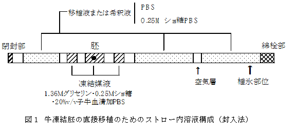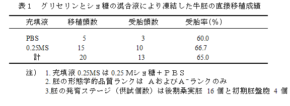 牛胚移植において、20%子牛血清加PBSの基礎培地に、1.36Mグリセリンと0.25Mショ糖を溶解した混合液を凍結媒液として形態ランクAおよびAーの胚を凍結し、融解後に直接移植できる。 |