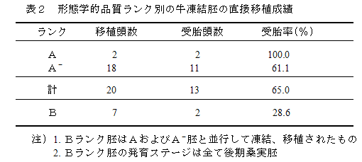 形態学的品質ランクBの胚は、受胎率が低いので本法による直接移植は避け、融解後に培養を行うなど、生存性を確認してから移植に供する(表2)。 |
