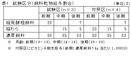 稲発酵粗飼料を肥育中期を除く肥育前、後期に給与することで、ビタミンA制御型肥育が可能である。 |