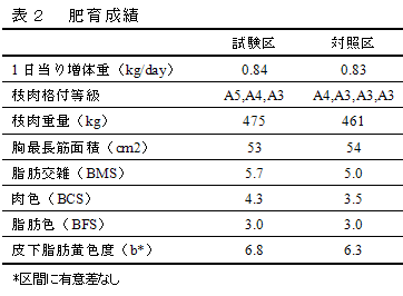 発育、枝肉格付成績に稲発酵粗飼料給与の影響は見られなかった(表2)。以上のことから、稲発酵粗飼料を肥育中期を除く肥育前、後期に給与することで、ビタミンA制御型肥育が可能である。
