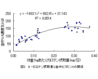 稲発酵粗飼料を給与した肥育前、後期の血中ビタミンA濃度は、体重1kgあたりのβ-カロテン摂取量(mg/日)をxとすると、 血中ビタミンA濃度(IU/dl)=-1493.1x2+882.91x+31.143の関係が成り立つ(R2=0.8514)(図2)。 |