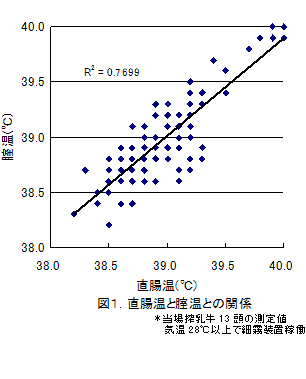 気温が30℃以上になると、送風機と細霧装置による暑熱対策を行っていても、膣温度が40℃近くになる牛が存在する(図2)。 |