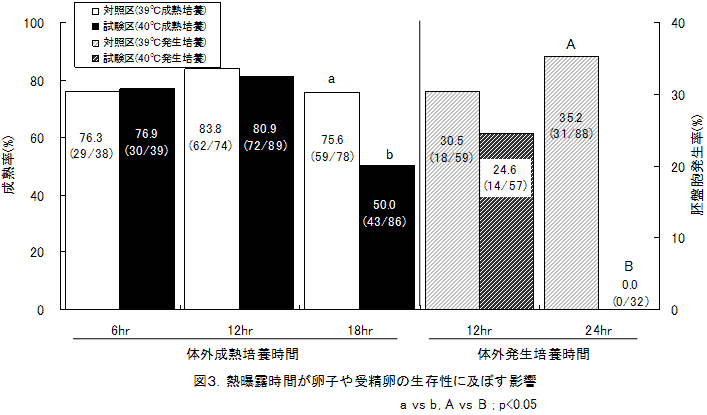 ウシ卵子の成熟率は、成熟培養初期18時間以上の熱曝露(40℃)により対照区(39℃)よりも有意に低くなる(図3)。 |