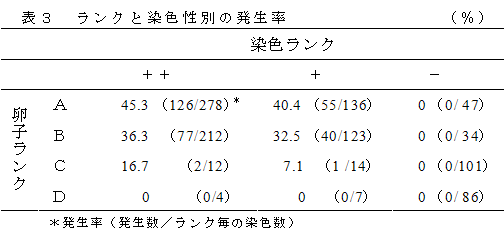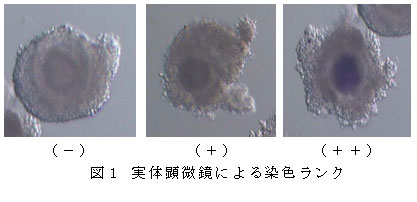 未成熟卵子を形態的にランク分けしBrilliant cresyl blue(BCB)で染色後、胚発生率を調査したところ、卵子の形態が良好でBCBに良く染色されるものは発生率が高く効率よく体外受精胚を作出できることから、この染色方法は高品質卵子の選抜に有効な手段である。 | ||||||