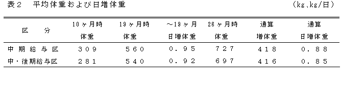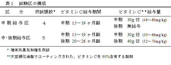 福井県畜産試験場では黒毛和種去勢肥育牛に対して肥育中期から出荷まで1頭体重1kg当たりビタミンC剤を30mgまたは60mg給与することにより、脂肪交雑が向上することを確認している。しかし、ビタミンC剤は高価であるため、効果的な添加給与期間を検討するとともに出荷月齢の短縮の影響についても検討する。 | ||||||||||