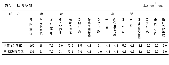 黒毛和種去勢肥育牛に対してビタミンC剤1日1頭当たり30gの肥育中期の給与は、中・後期までの給与と比べて脂肪交雑や肉のしまりに差がなく、肥育中期のビタミンC剤給与で肉質向上が期待される。 | ||||||||||
