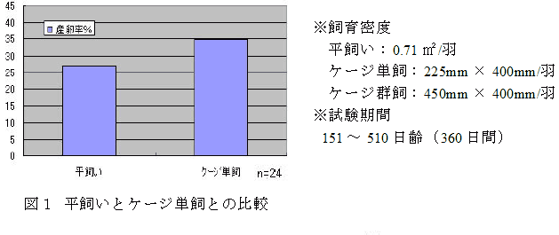 産卵率(ヘンデイ産卵率、以下同じ)は、平飼いに比較しケージ単飼が高い(図1)。 |