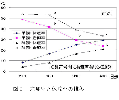 ケージ飼育では、単飼に比較し群飼の産卵率が高く推移し、300日齢以降は群飼の方が高い。また、休産鶏の割合(以下、休産率)は産卵率の低下に伴い増加する(図2)。 |