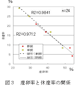 産卵率と休産率には負の相関が認められることから(図3)、産卵率を向上させるには休産率の上昇を抑える必要がある。 |