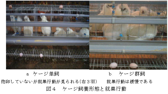 平飼いでは強い抱卵・就巣行動が見られ、ケージ単飼でも就巣行動が散見されるが、ケージ群飼での就巣行動は比較的緩慢である(図4)。 |