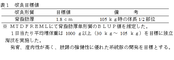 これまで豚の系統造成は環境の均一化を図るため単一場所で造成されてきた。BLUP法アニマルモデルを用いることで、異なる環境間を補正して育種価評価を行うことが可能である。複数の場所で系統造成を行うことで、造成規模を拡大することができ、より少ない経費で効果的な改良が可能となる。本研究では岐阜県及び愛知県で要望の高いデュロック種の系統造成を共同で行った。造成の目標は、発育が早く、脂肪の付着が適度であり、肢蹄が丈夫で長持ちのするもの、体型的には太く深みのあるものを目指したものである。 | ||||||||||||||