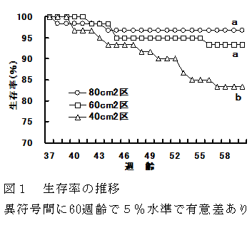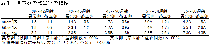 異なる飼育密度(80cm2、60cm2及び40cm2/羽)でニホンウズラを36週から60週齢まで飼育すると、40cm2区に比べ80cm2区や60cm2区は生存率や産卵率(ヘンハウス)が高く、更に47から60週齢で茶玉卵を含んだ異常卵の発生も低い傾向がみられる。 | ||||||||||||