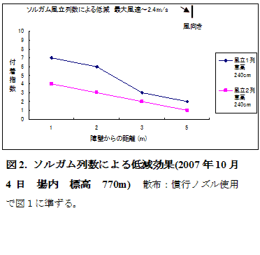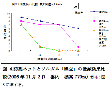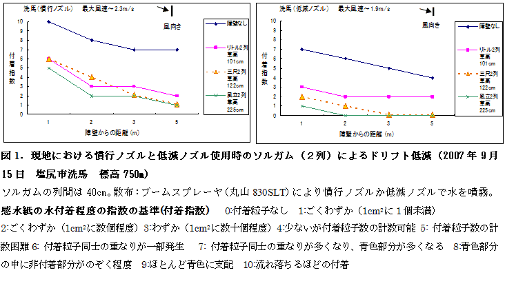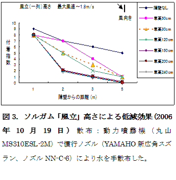 ドリフト低減効果は、ソルガムの草高が150cm以上で明瞭に認められ、100cm以下では効果は劣る(図3)。また、品種「風立」の2列播きは網目1mmの防薬ネットを二重に設置した時と同等の効果がある(図4)。 |
