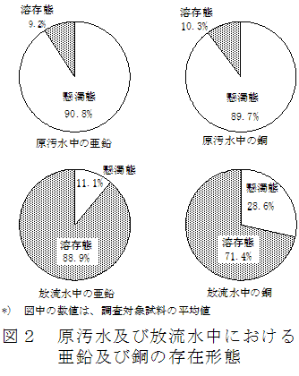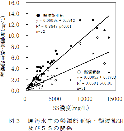55件の養豚浄化槽から採水した原汚水中の亜鉛及び銅については、その9割が懸濁態であり、懸濁態の亜鉛及び銅は浮遊物質(SS)と高い相関を示すため、SSを除去することで亜鉛及び銅の総量を低減化できる。 | ||||||||||