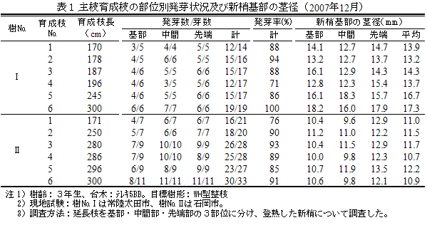 ブドウの無核栽培では、ジベレリン処理や摘心・誘引・せん定などの管理作業が効率的に行える短梢せん定が増加している。短梢せん定は、主枝の両側に30cm前後の間隔で結果母枝(芽座)を配置する必要があり、主枝候補枝として延長する結果母枝(主枝育成枝)の発芽状況が大きく影響する。そこで新品種「シャインマスカット」の発芽・生育特性を把握し、短梢せん定に適するかどうか検討する。 | ||||||||||