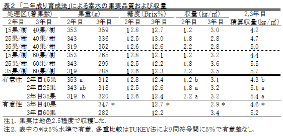 樹体管理として、2年目の着果数を25果、3年目を40果とすることで、主枝から配置した側枝は2年目が8本で6.3m、3年目が17本で16.8m、葉果比は50程度となる(表1)。 |