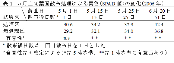 マンガン欠乏樹には、0.3%硫酸マンガン溶液を欠乏症状発生前の5月上旬から約10日間隔で3回葉面散布する。これにより葉色の低下が抑えられ、葉脈間黄白化症状が改善される(表1)。 |