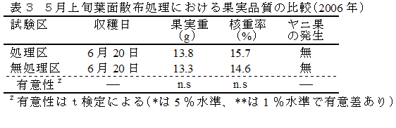 硫酸マンガン葉面散布処理による果実重、核重率、ヤニ果有無への影響は認められない(表3)。 |