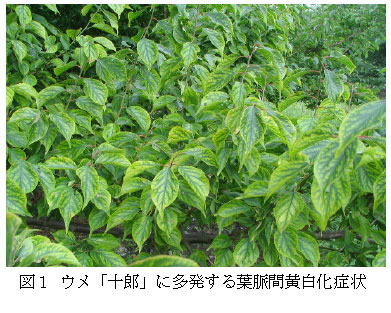 ウメ「十郎」の葉脈間黄白化症状は火山灰土壌を中心に多発しており、症状は5月中旬から枝単位で発生するが、激しい場合は樹全面に発生する(図1)。 |