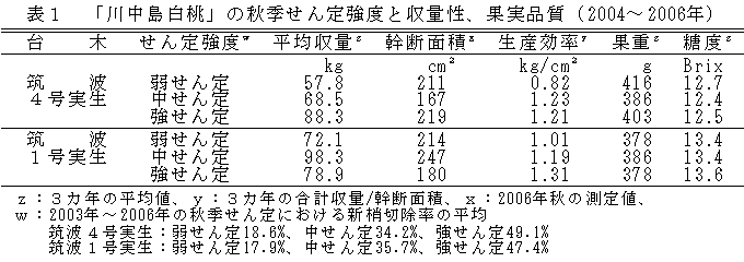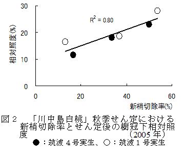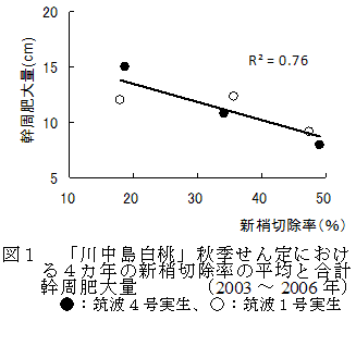 モモ「川中島白桃」の秋季せん定は新梢切除率3割程度を上限とする。 | ||||||||||