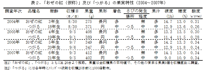 さびの発生はほとんどなく、果汁は中~多である。果肉はやや粗く、やや軟らかい(表2)。食味は甘酸適和、渋みは少ない。香りは良好である。蜜入りはなく、心かびの発生は認められていない。 |