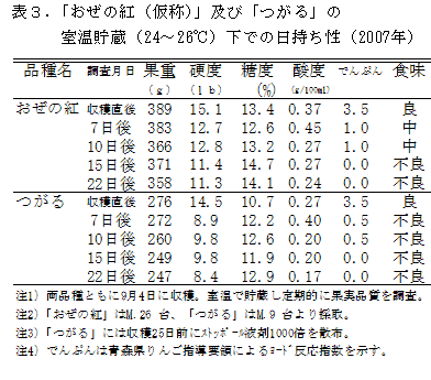 日持ちは室温下で約10日と考えられ、「つがる」に比較して、着色、外観や日持ち性に優れる(表3、図1)。 |