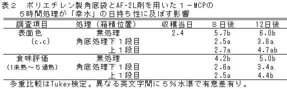 500kg規模の「幸水」果実に対してポリエチレン製の大型角底袋を利用し、濃度1ppmの1-MCP5時間処理で、収穫後8日間以上鮮度を維持できる。空気中の水分により1-MCPガスが発生するリボンタイプのAF-2L剤でも十分な鮮度保持効果が得られる。 | ||||||||