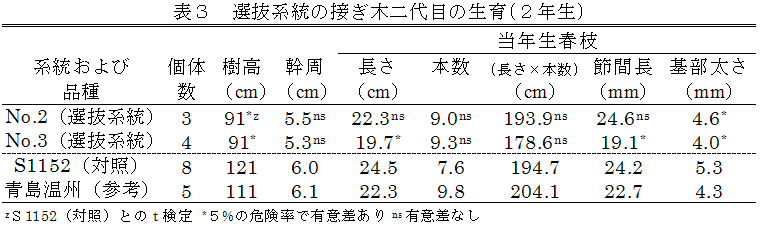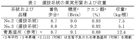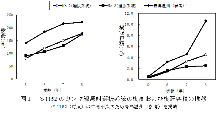 「青島温州」の珠心胚実生から選抜したS1152は、樹勢が強く結実が安定しない。そこで、S1152の穂木にガンマ線を照射し、樹勢の落ち着いた系統を選抜する。 | ||||||