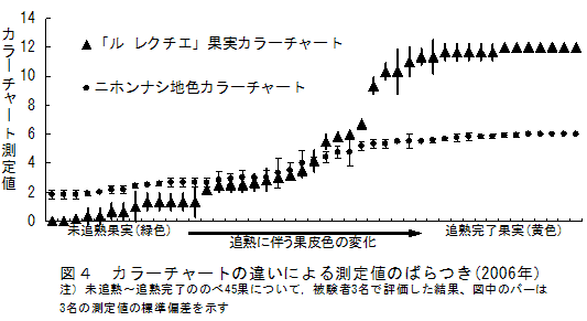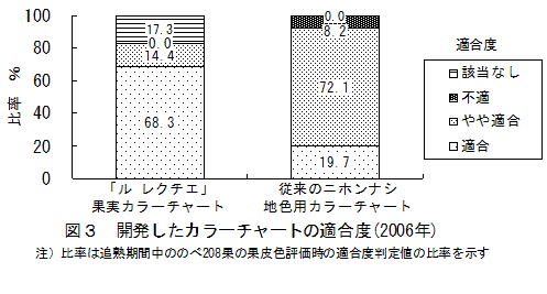果実画像を用いて開発した「ル レクチエ」専用の果実カラーチャートは、従来のニホンナシ地色カラーチャートに比べて測定精度が高く、追熟に伴う果皮色変化の評価に利用できる。 | ||||||||
