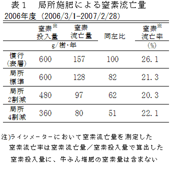硝酸態窒素の流亡量は、慣行栽培に比べて、局所施肥の標準量施肥で約2割、2割減肥で約4割減少する(表1)。 |