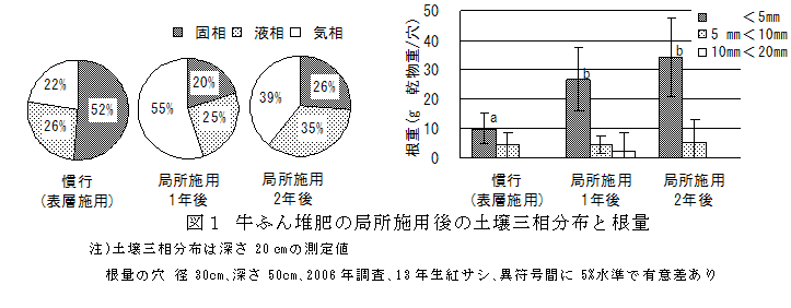 牛ふん堆肥を局所施用した土壌では、気相率が増え、根径5mm以下の根量が増加する。局所施用後、1年経過した土壌に比べて2年経過した土壌の気相率は減少するが、慣行栽培(牛ふん堆肥を表層施用)の土壌より気相率は高く保たれる(図1)。 |