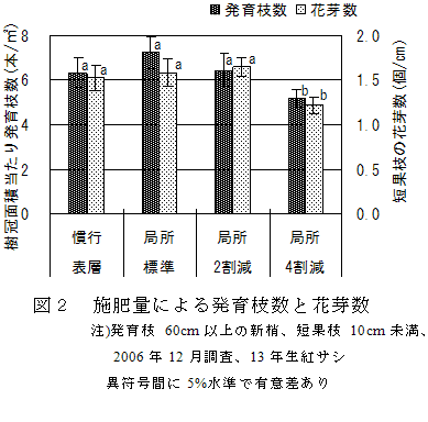 局所施肥2割減肥の樹冠面積当たり発育枝数、および短果枝の花芽数は、慣行栽培に比べて、同程度であり、局所施肥により施肥量を2割減肥できる(図2)。 |