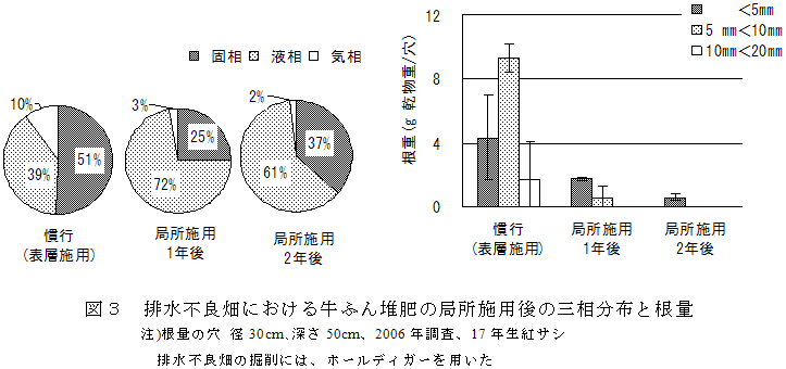 排水不良の水田転換畑(地下水位50cm)では、掘削による堆肥の局所施用により、土壌の液相率が増加するので、酸素要求量の高いウメの根は、ほとんど伸長しない(図3)。 |