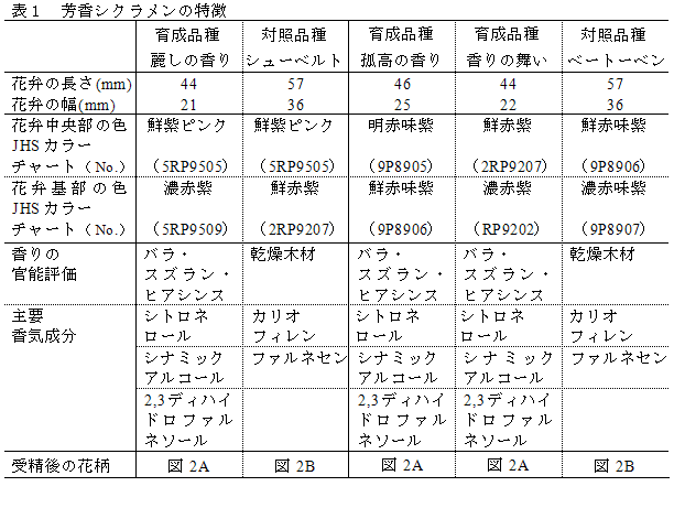 園芸品種と野生種の種間交雑により育成された芳香シクラメンの特徴 | ||||||||||