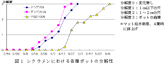 植替え時の強度とその後の順調な活着を考慮した場合、一般的な品目ではデンプン5%程度を混合したポットを用い、シクラメンの様に育苗期間が長いものではPBS100%のポットを用いる(図1)。 |