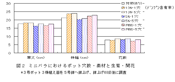 直に植込むポットは、ポットに2%以上の開口部があると活着は良好であり(既報告)、9cmの育苗ポット底面にカド穴4個(直径10mm)を設け、底穴と併せて5個の開口部があれば、活着に良好な開口率となるため、鉢替え時にポットの分解度が不均一であっても、慣行の鉢替えと同等な生育が得られる(図2)。 |