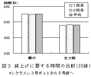 育苗したポット苗を、仕上げ鉢にポットごと直接植替える「直鉢替え栽培」により、慣行の鉢替えを行う場合に比べ、10~20%程度鉢替えに要する時間を短縮することが可能で、抜き取ったポットがゴミとならないため、ゴミの減量化にも繋がる(図3)。 |