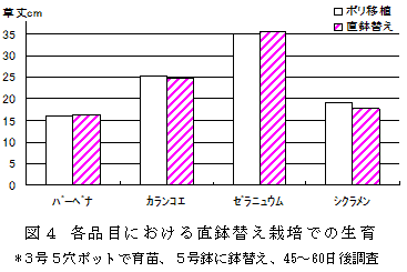 底面マット給水において、ミニバラ、バーベナ、カランコエ、ゼラニュウム、シクラメン、ガーベラ(データ省略)等で育苗時に生分解性ポットを利用し、直鉢替え栽培を行っても、ポリポットからの移植栽培と同等の生育が得られ、利用による障害は認められなかった(図4)。 |