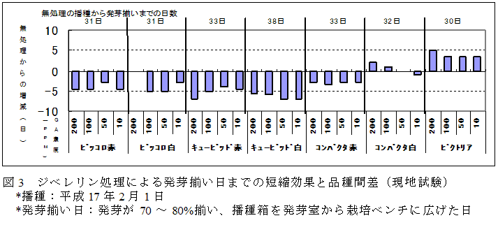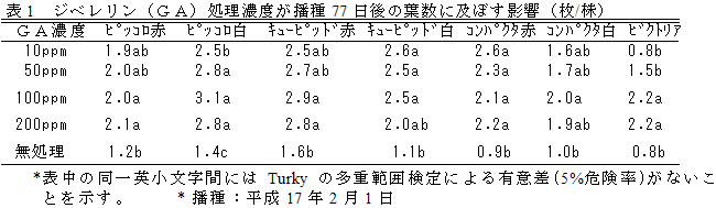 シクラメン乾燥種子に対して、播種前にジベレリン溶液に浸漬処理後、風乾してから播種することにより、発芽促進効果がみられ、発芽が早まる。処理濃度は50ppm、浸漬時間は5分間程度でよい。発芽揃いが早まることに加え初期生育の促進効果もみられる。 | ||||||||
