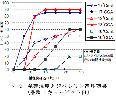 シクラメンは、播種から発芽まで一ヶ月以上かかり、通常は、加温設備があるハウス内で発芽・育苗が行われるが、播種した時期により発芽率が大きく変動することがある。発芽を揃えることはその後の生育の揃いに大きく影響するとともに、種子のロスを減らすことでコスト低減につながる。そこで、シクラメン種子に対するジベレリン処理が発芽揃いを早める効果を検討する。 | ||||||||