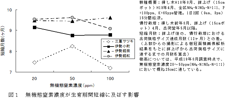 養液の無機態窒素濃度を20~50ppm(NH4-N:NO3-N=1:1)で管理することで、鉢上げ後、量販店の流通規格(高さ25cm株張り25cm)に到達するまでの期間を、慣行コンテナ栽培と比べて伊勢シリーズで9ヶ月、「三重サツキ」で7~8ヶ月短縮できる(図1)。 |