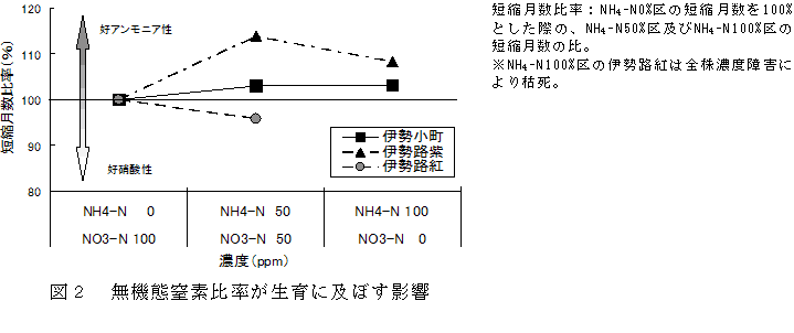 生育期間の短縮が期待できる無機態窒素の構成は、品種によって異なる。「伊勢小町」はNH4-N比率が高いほど、「伊勢路紅」はNO3-N比率が高いほど適し、「伊勢路紫」はNH4-N:NO3-N=1:1が適する(図2)。 |