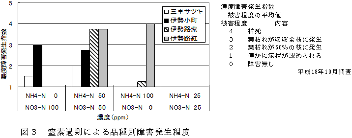各品種とも高濃度の無機態窒素によって生育障害が発生するが、窒素濃度50ppm(NH4-N:NO3-N=1:1)以下では発生しない。また、障害の発生には無機態窒素組成により違いがあり、「伊勢路紅」及び「伊勢路紫」はNH4-N耐性が低く、「伊勢小町」及び「三重サツキ」はNO3-N耐性が低い(図3)。 |