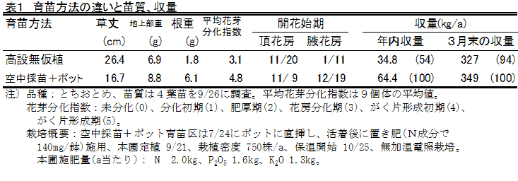 本方式を用いた採苗本数は、4月中旬親株定植で197本/m2(9月上旬採苗)、5月中旬定植で134本/m2(9月下旬採苗)である(データ省略)。ポット苗に比べ、花芽分化が遅く、年内収量も少ないが、3月末までにはほぼ同等の収量に追いつく(表1)。 |